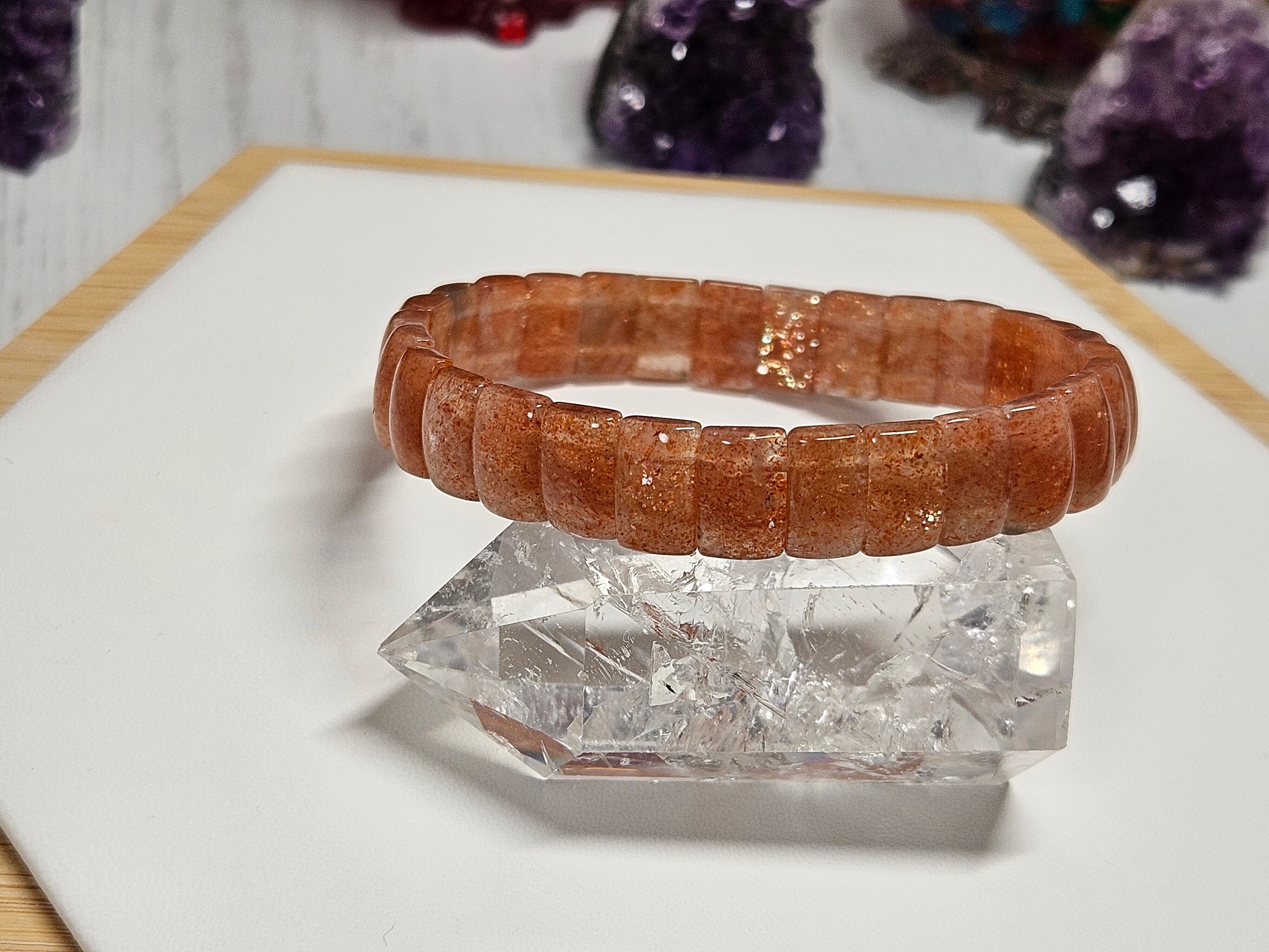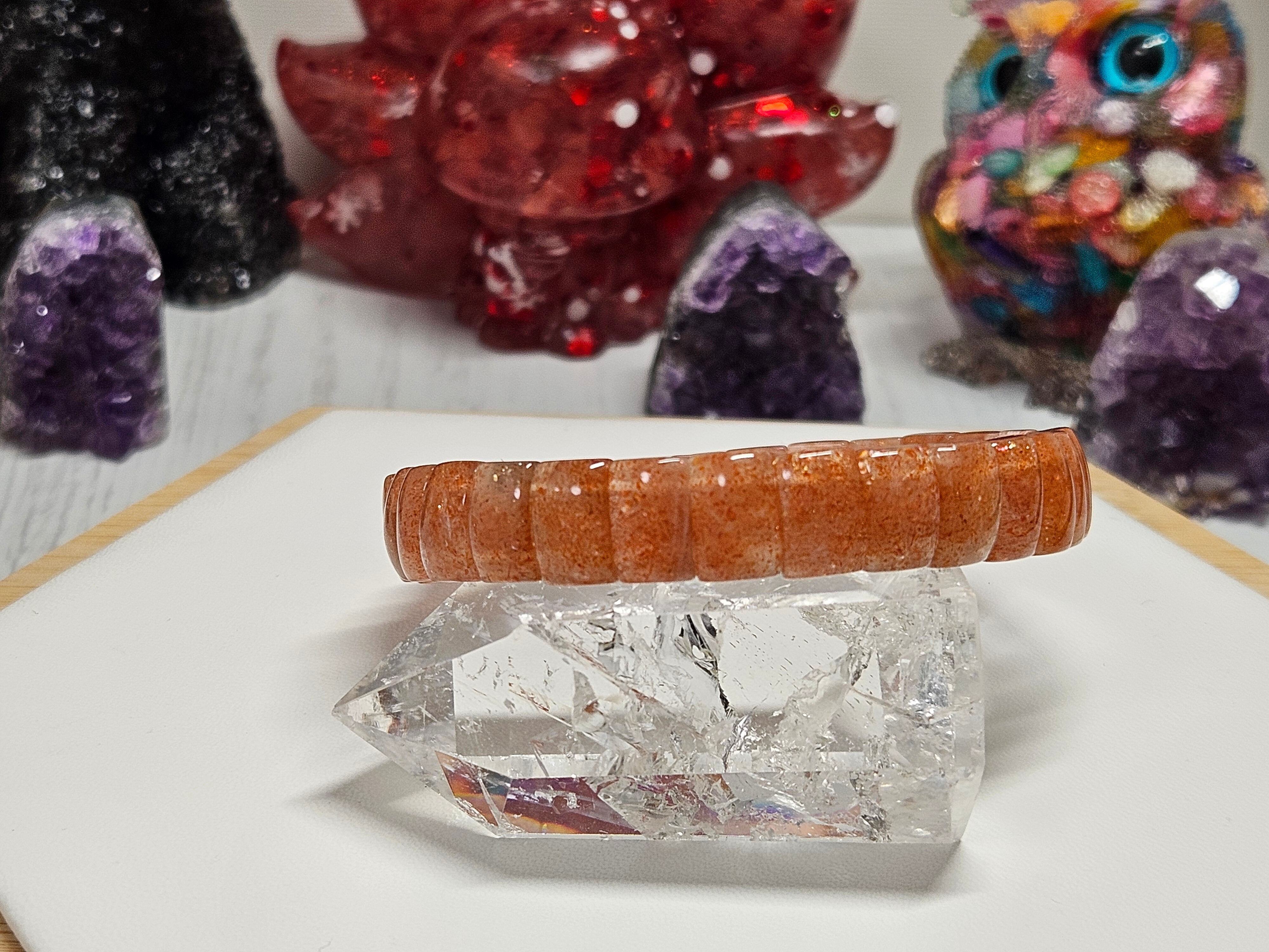 サンストーンは、赤やオレンジ色のキラキラと輝く鉄成分の鉱物を内包する石で、ムーンストーンやラブラドライトと同じフェルスパー(長石)グループに属しています。